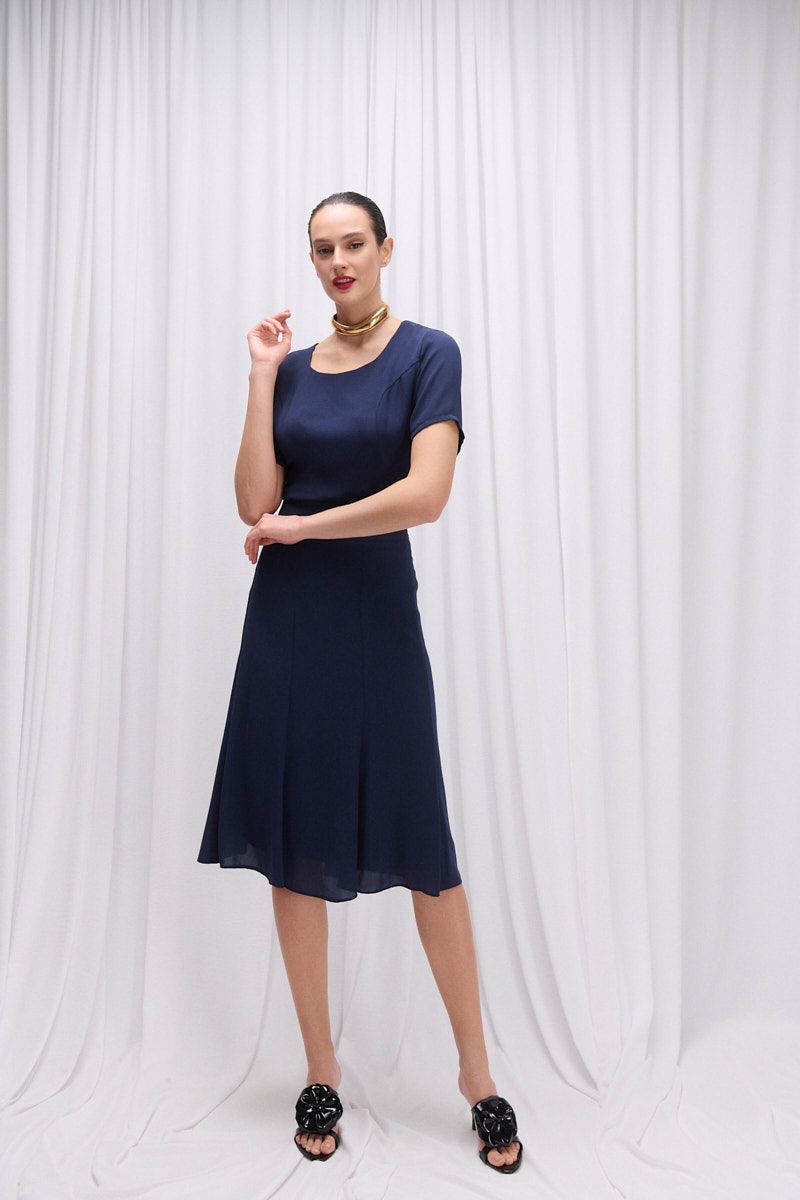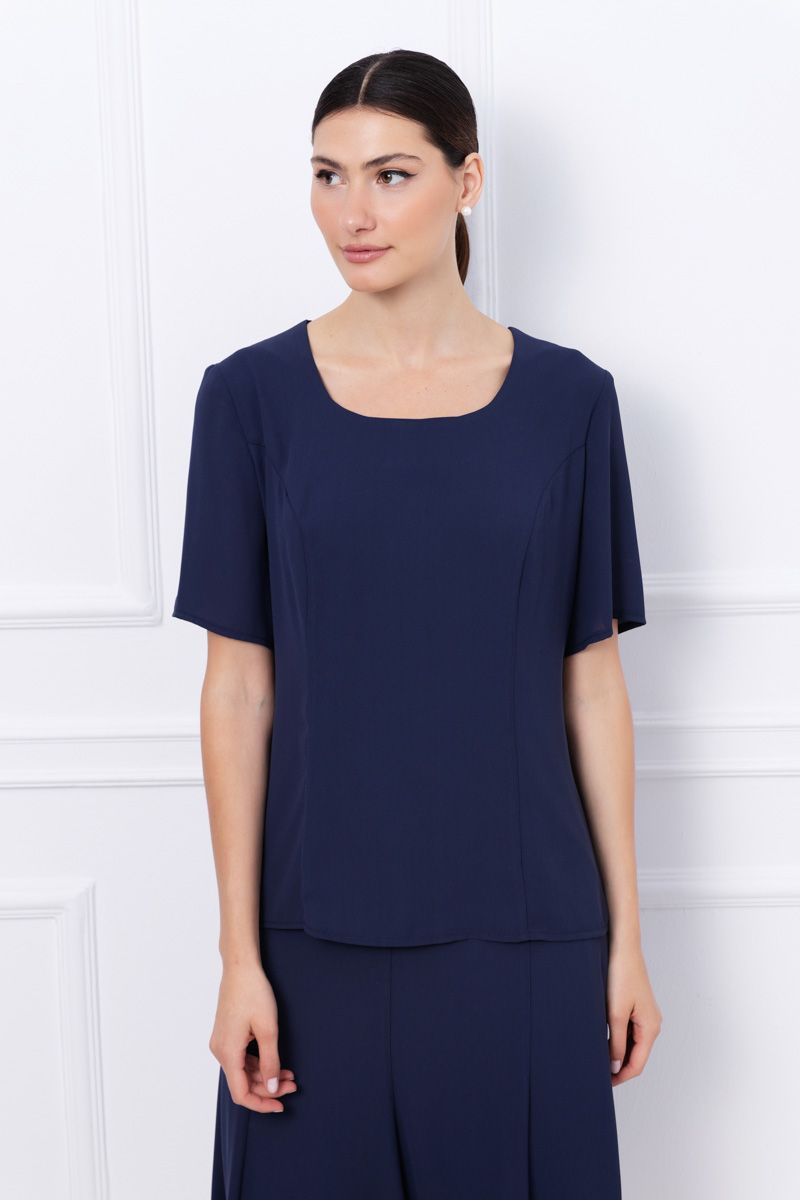Κοντομάνικη μουσελίνα μπλούζα με στρόγγυλη λαιμόκοψη, κλείσιμο πίσω με κρυφό φερμουάρ στη ραφή, φοδραρισμένη.
