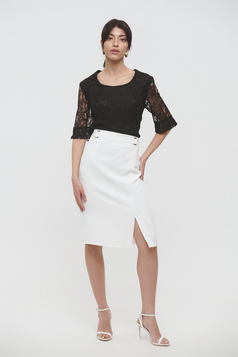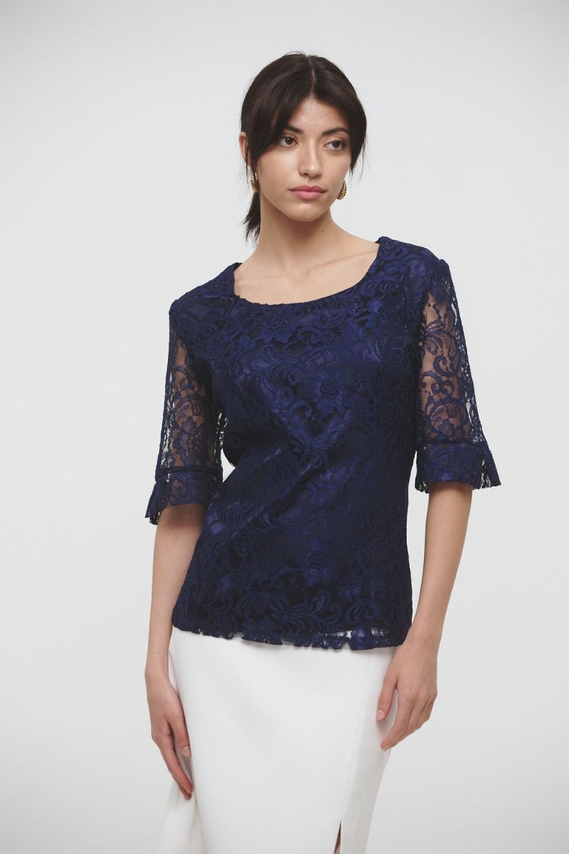 Μπλούζα από δαντέλα, 3/4 μανίκι με άνοιγμα στο τελείωμα, κλείσιμο πίσω με κρυφό φερμουάρ στη ραφή, φοδραρισμένη.