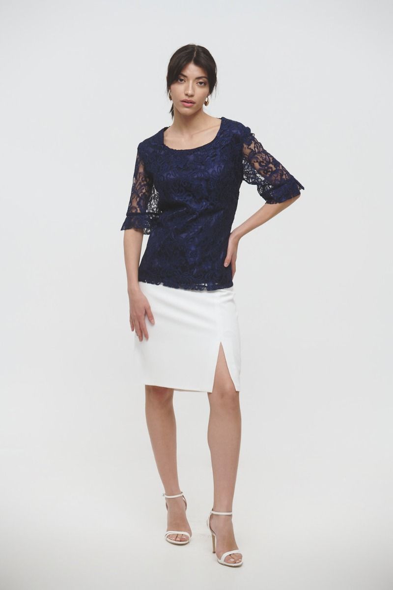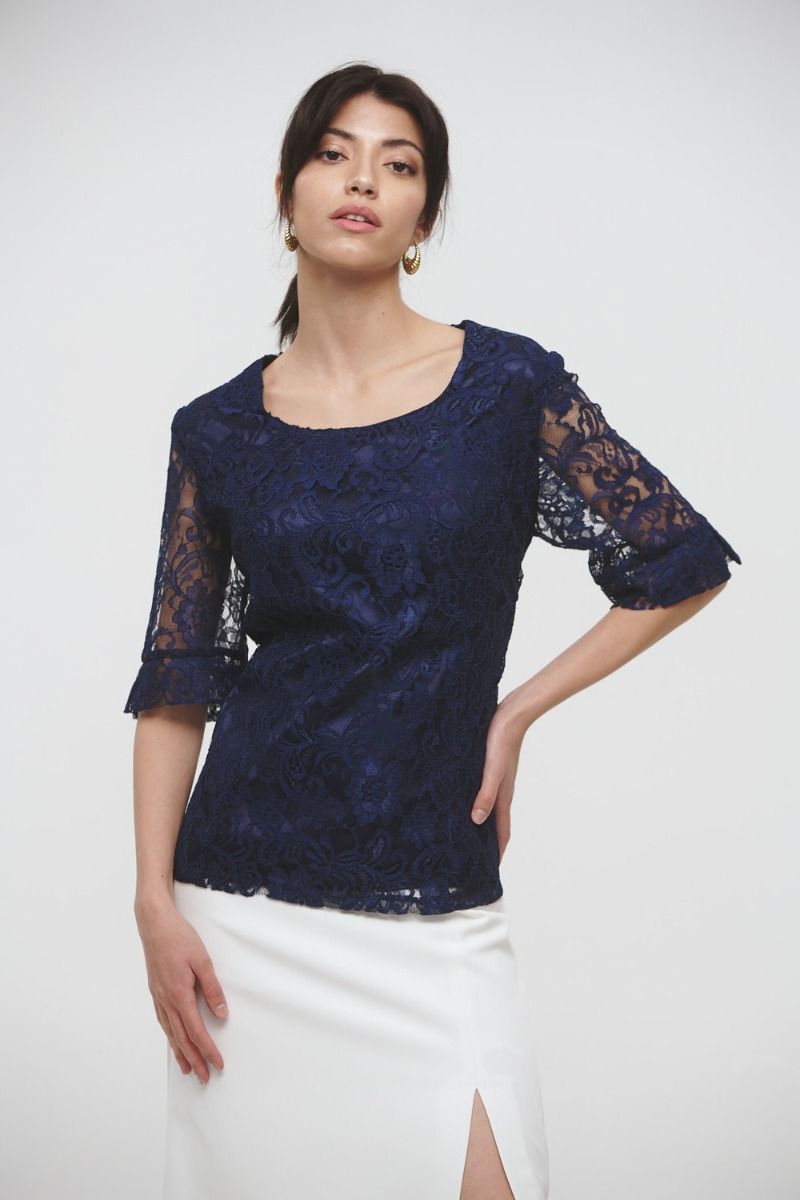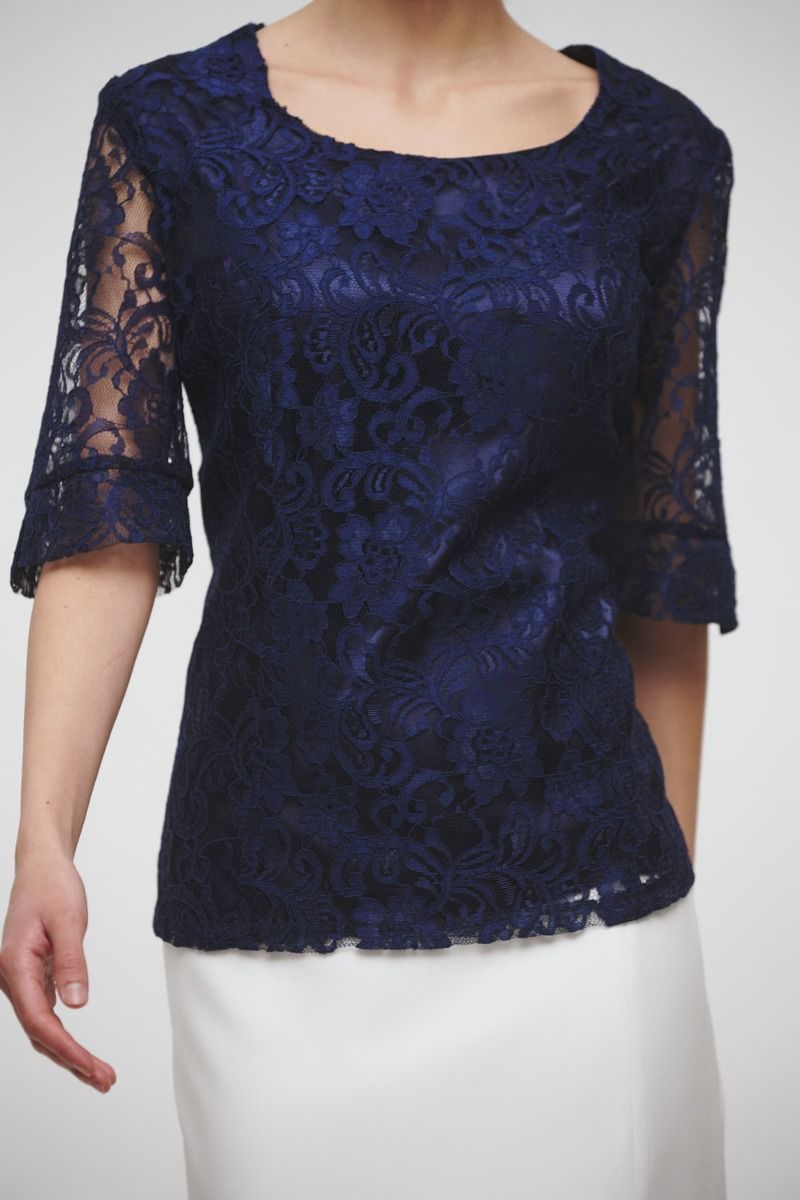 Μπλούζα από δαντέλα, 3/4 μανίκι με άνοιγμα στο τελείωμα, κλείσιμο πίσω με κρυφό φερμουάρ στη ραφή, φοδραρισμένη. Για κομψές και στιλάτες εμφανίσεις.