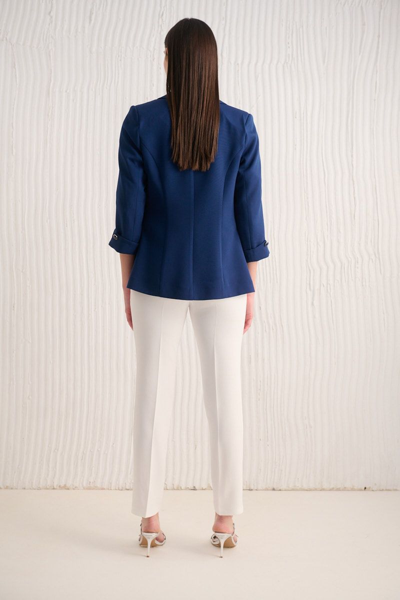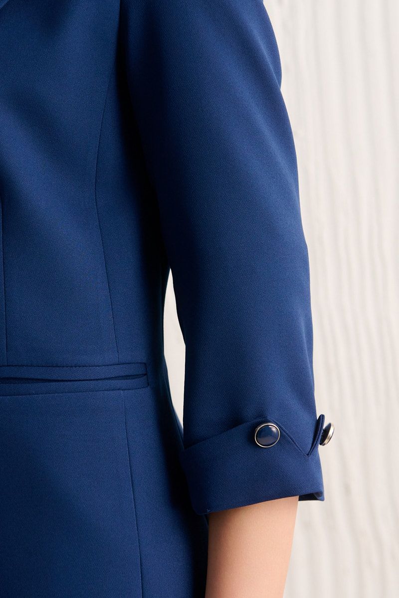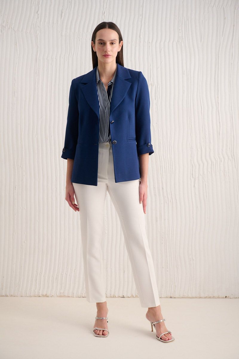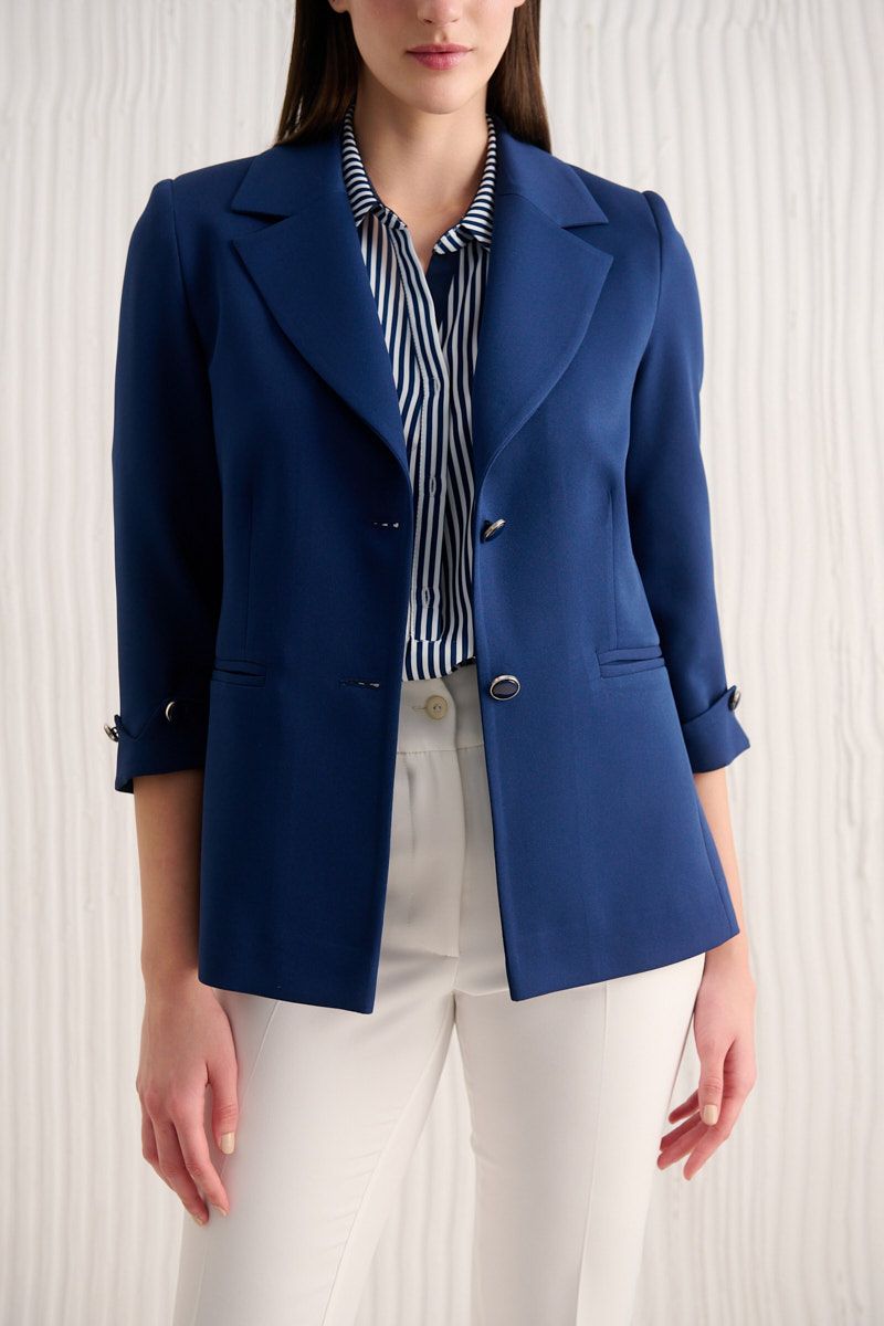 Σακάκι κρεπ με πέτο γιακά, 3/4 μανίκι με μανσέτα και κουμπιά, βάτες στους ώμους, κλείσιμο μπροστά με κουμπιά, μπροστινές τσέπες με ρέλι, φοδραρισμένο μπροστά.