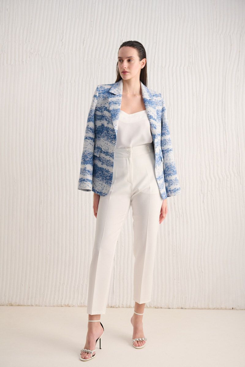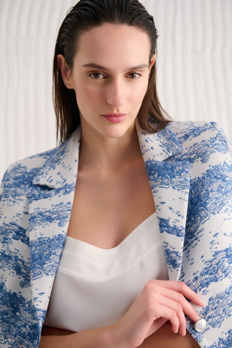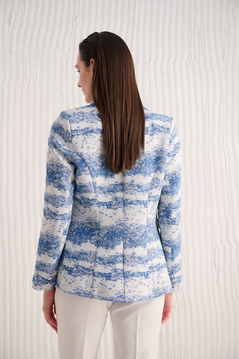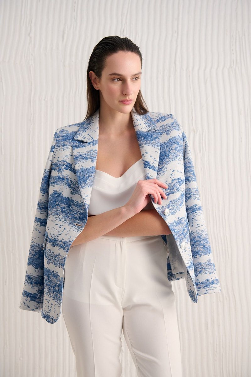 Μπροκάρ σακάκι με πέτο γιακά και λούρεξ στην ύφανση, βάτες στους ώμους, μακρύ μανίκι με διακοσμητικά κουμπιά στο τελείωμα, τσέπες με καπάκι μπροστά, κλείσιμο με κουμπιά, φοδραρισμένο στο μπροστινό μέρος.