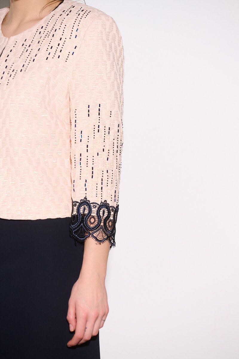 Σετ αποτελούμενο από κοντό μπροκάρ σακάκι με στρας, 3/4 μανίκι με δαντέλα στο τελείωμα, βάτες στους ώμους, κλείσιμο μπροστά με κόπιτσα, φοδραρισμένο, μίντι κρεπ φόρεμα με κοντό μανίκι, στρας μπροστά, άνοιγμα στο πίσω κάτω μέρος, κλείσιμο πίσω με κρυφό φερμουάρ στη ραφή, φοδραρισμένο.