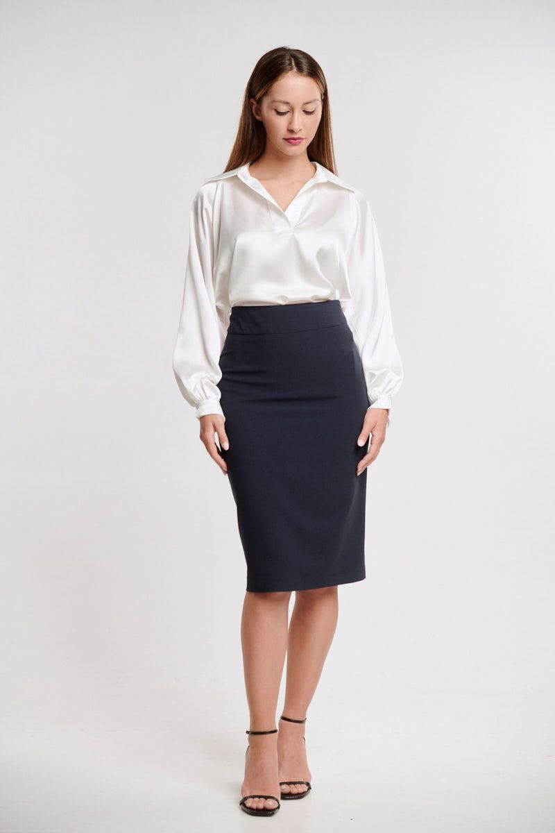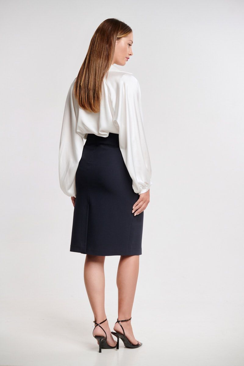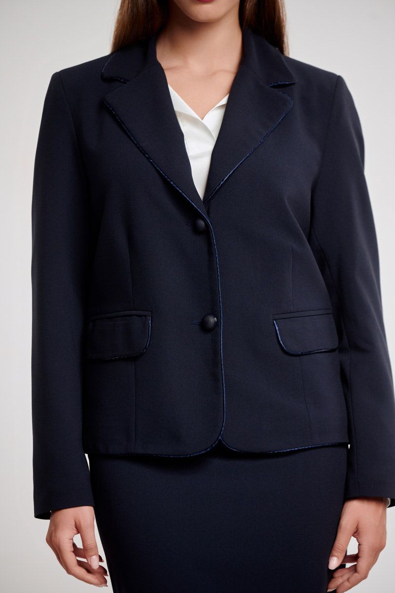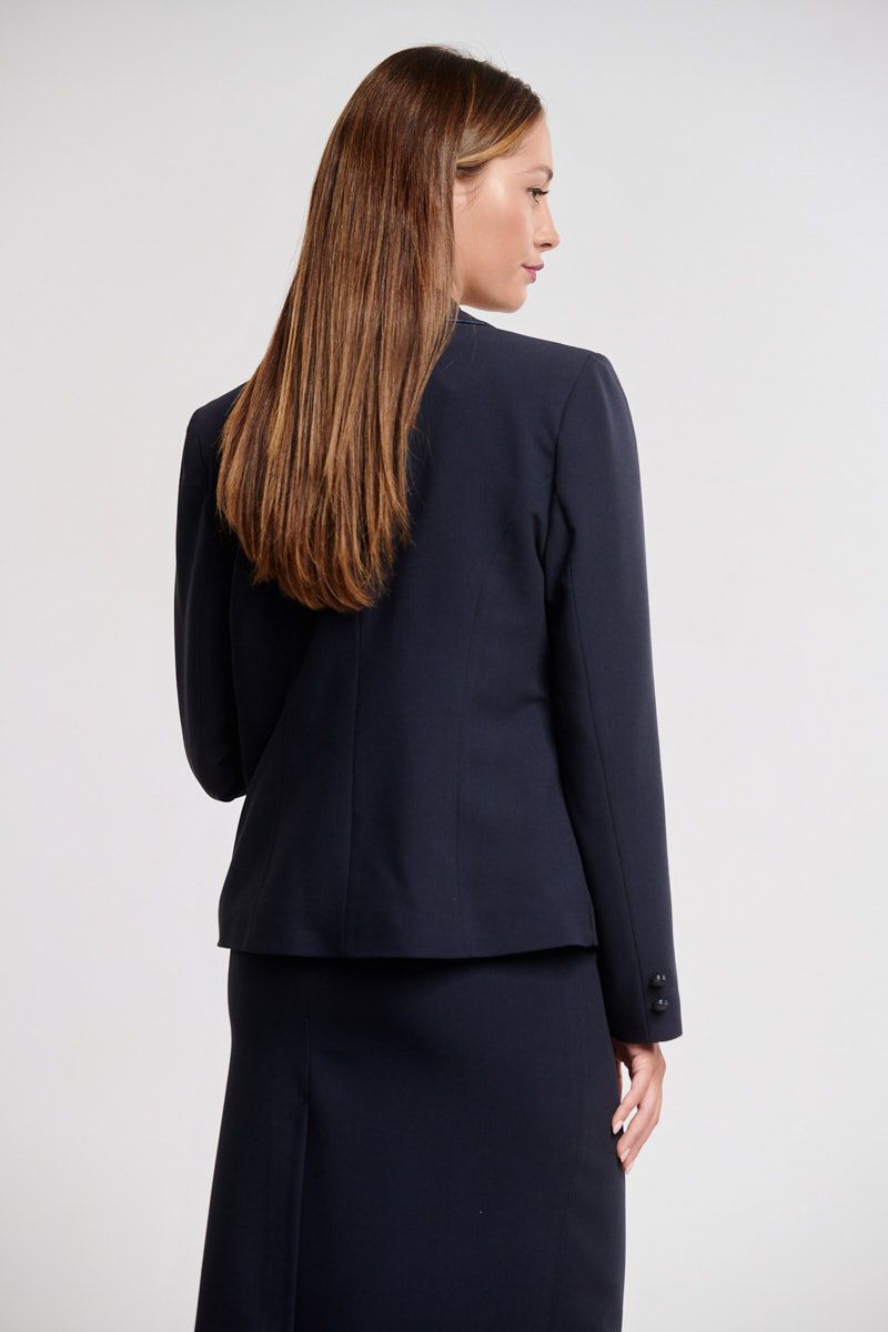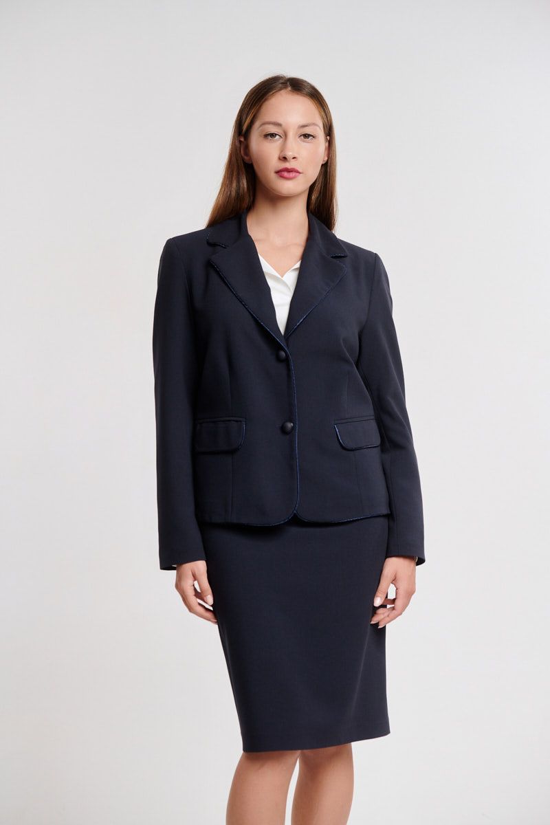 Ταγιέρ αποτελούμενο από κρεπ σακάκι με πέτο στο γιακά, μακρύ μανίκι, σταθερή εφαρμογή, δύο τσέπες με καπάκι μπροστά, λεπτές βάτες στους ώμους για καλύτερη εφαρμογή, φυτίλι στο τελείωμα του μπροστινού μέρους, φοδραρισμένο εσωτερικά, ψηλόμεση κρεπ μίντι φούστα σε κανονική γραμμή, σταθερή εφαρμογή, μικρό άνοιγμα πίσω, φοδραρισμένη, κλείσιμο με κρυφό φερμουάρ στο πίσω μέρος.